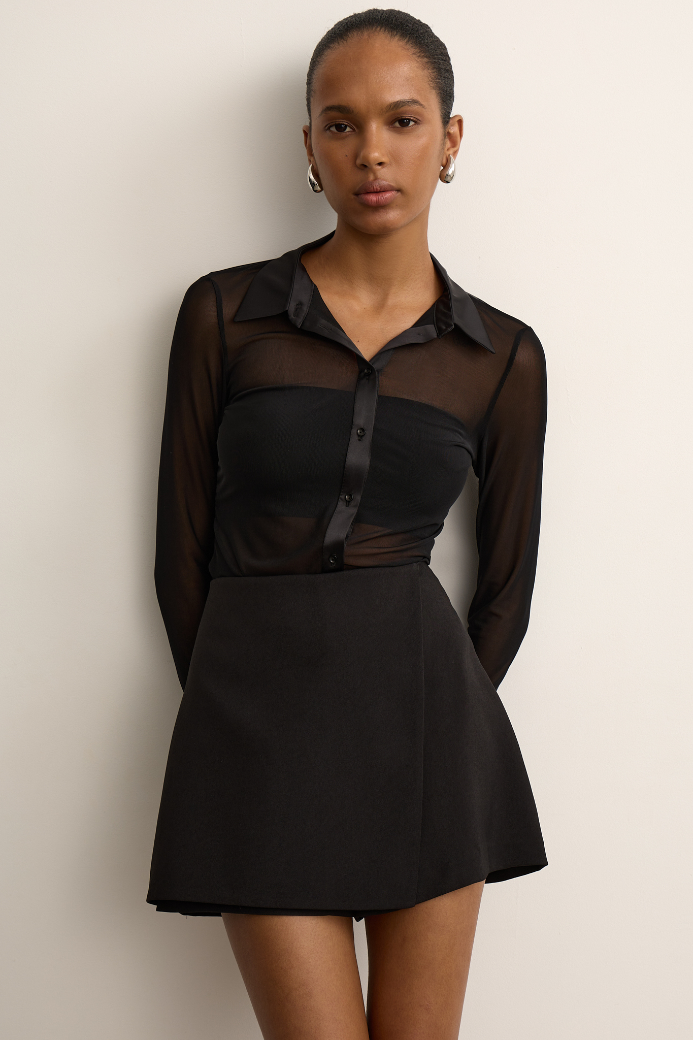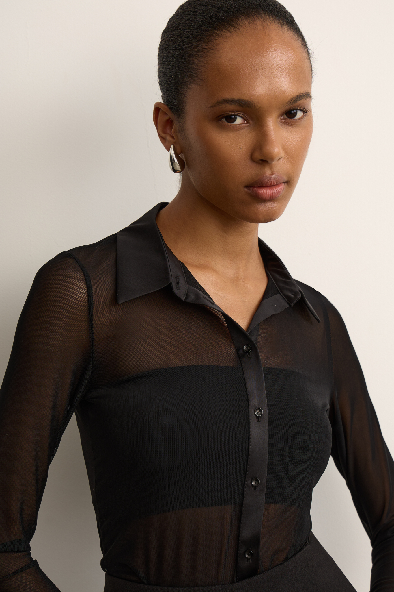 Особенная рубашка для эстетских и чувственных образов. Прозрачная сетка дополнена вставками с гладкой фактурой: по атласным планке и воротничку так приятно скользить пальцами. Рукава без манжет, не слишком свободные и не обтягивающие, роднят эту необычную рубашку с лонгсливами. С ними модель смотрится ещё элегантнее. Рубашку можно носить как второй слой с шёлковыми топами на тонких бретелях или с облегающим боди чёрного цвета. Завершить образ можно струящейся юбкой в бельевом стиле, юбкой из костюмной ткани любой длины, кожаными брюками или базовыми джинсами.