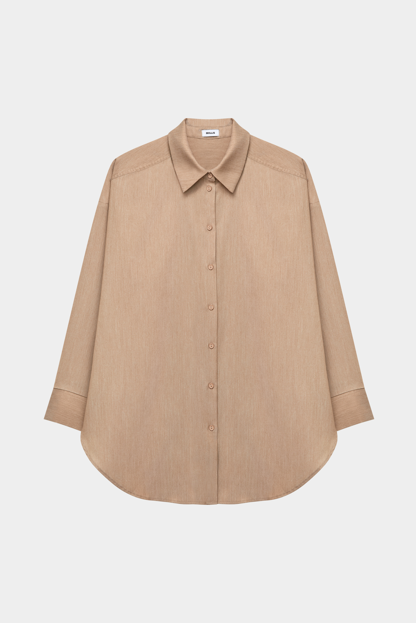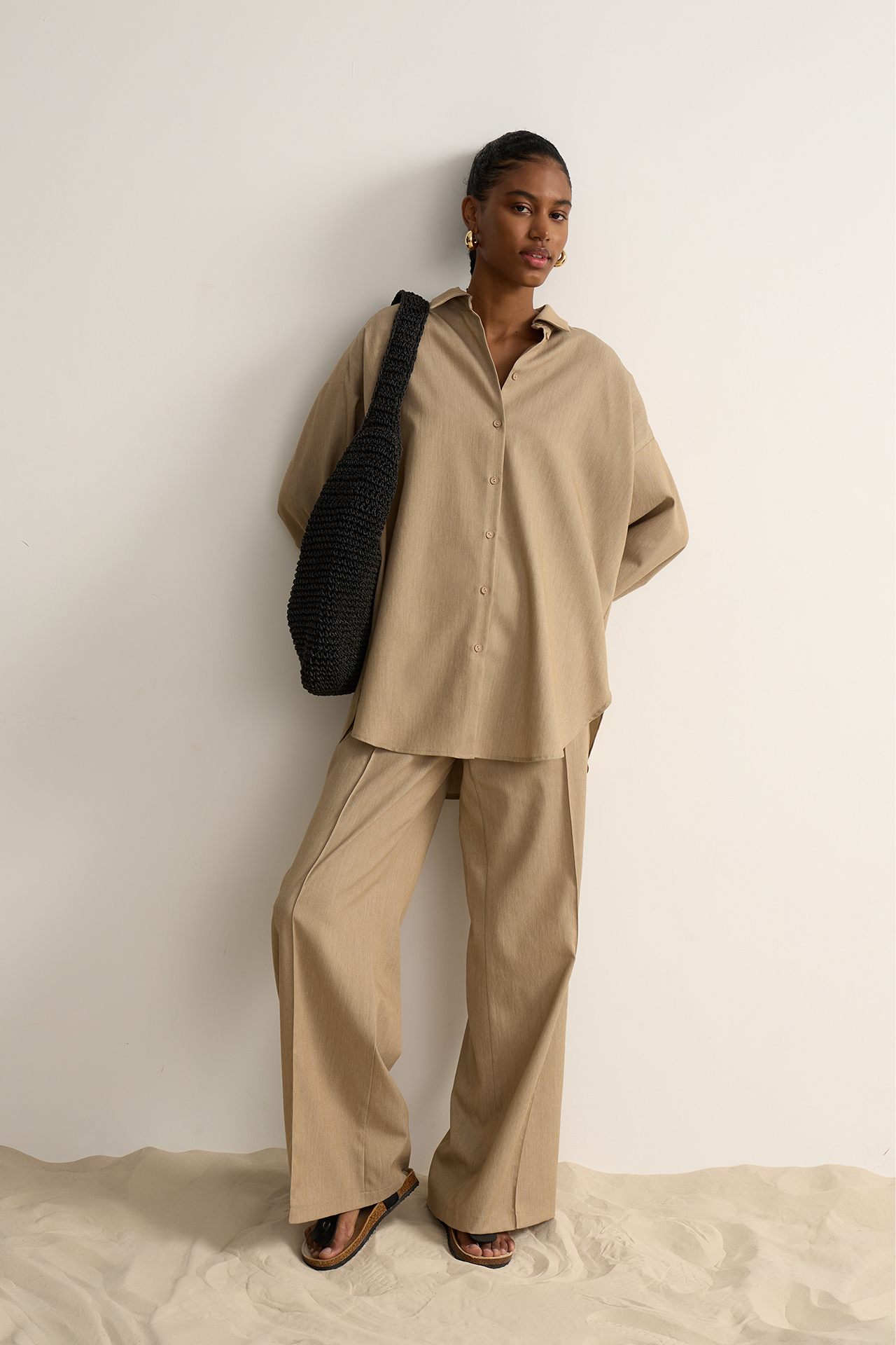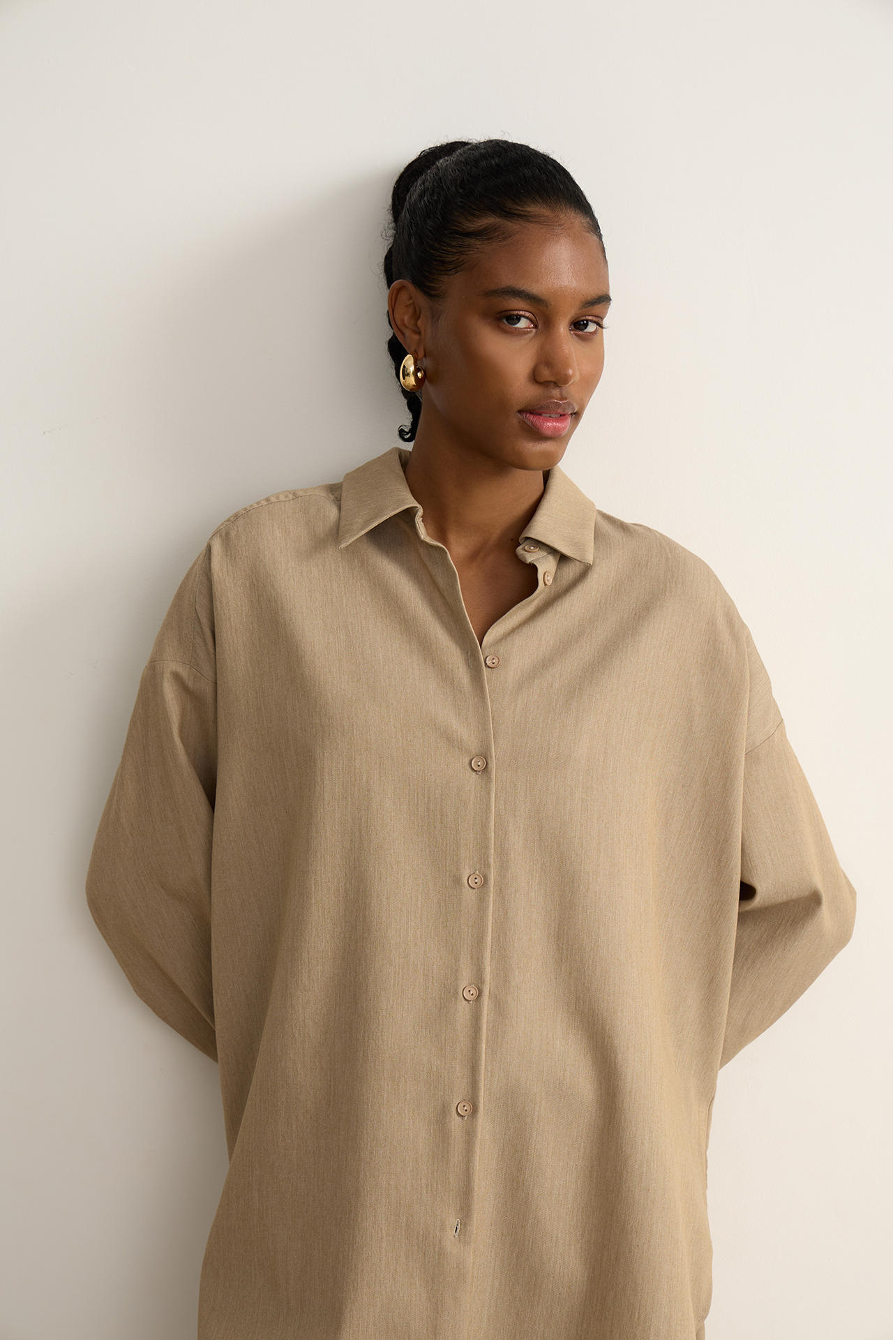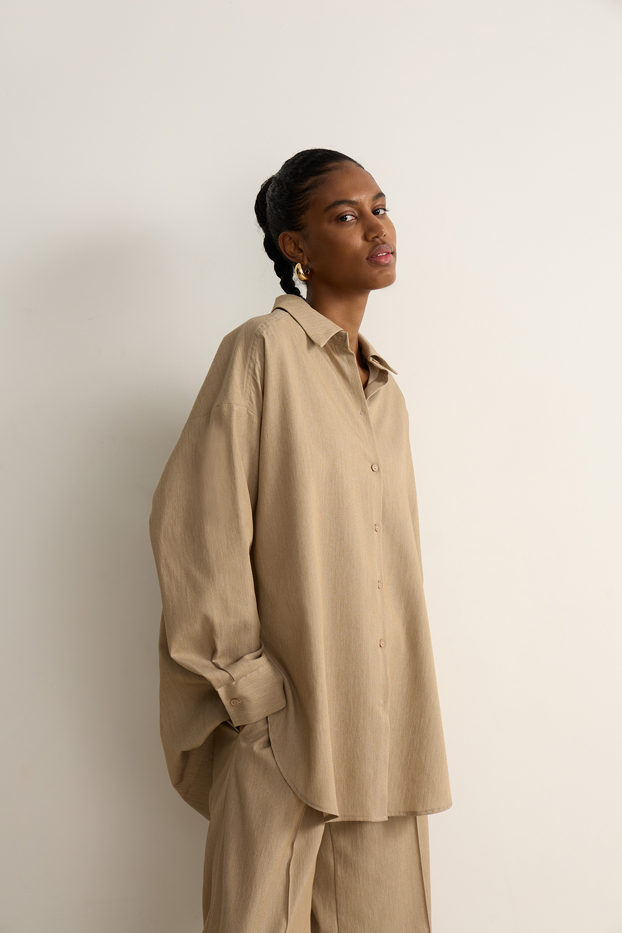 Бежевая удлиненная рубашка оверсайз выполнена из комфортного летнего материала с модным эффектом меланж — смешения цветов в окраске. Это делает образ более естественным и живым. В составе материала — 72% льна и 23% хлопка. Стилизуйте рубашку разными ремнями или носите свободной, с брюками из комплекта или светлыми шортами.